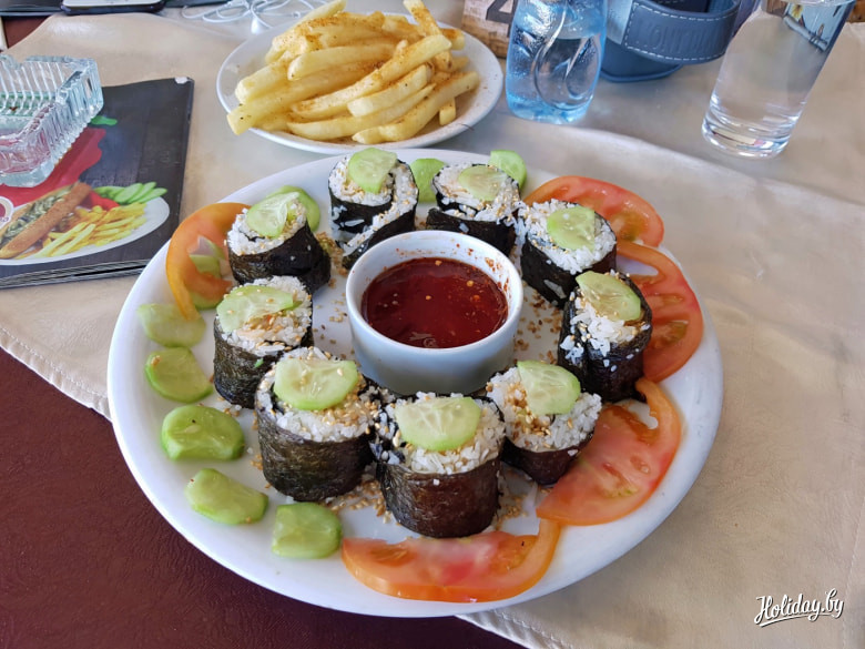 В окрестностях парка есть два хороших ресторана домашней палестинской кухни «Matoug» и «Zad al-Khayr»: в обоих есть меню на английском языке, а последний работает даже в пятницу, когда почти все другие заведения закрыты. Ещё рядом со зданием Палестинского законодательного совета, т.е. местного парламента (в самом начале парка), есть ресторан «Kazameza». Это единственное место в Секторе, где можно поесть суши (а я их обожаю!). Не без иронии, конечно, потому что суши там своеобразные, начинка зависит от наличия ингредиентов, рис рассыпается, нори липнет к палочкам и всё это нужно суметь макнуть в густой соус барбекью.