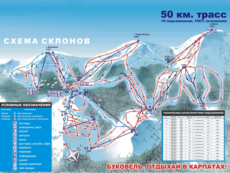В Буковеле оборудованы 7 «синих» трасс (для начинающих лыжников), 28 «красных» (средней степени сложности) и 7 «черных» (высокого уровня сложности), а еще есть санная трасса. Длина трасс варьируется в пределах от 300 до 2300 метров.