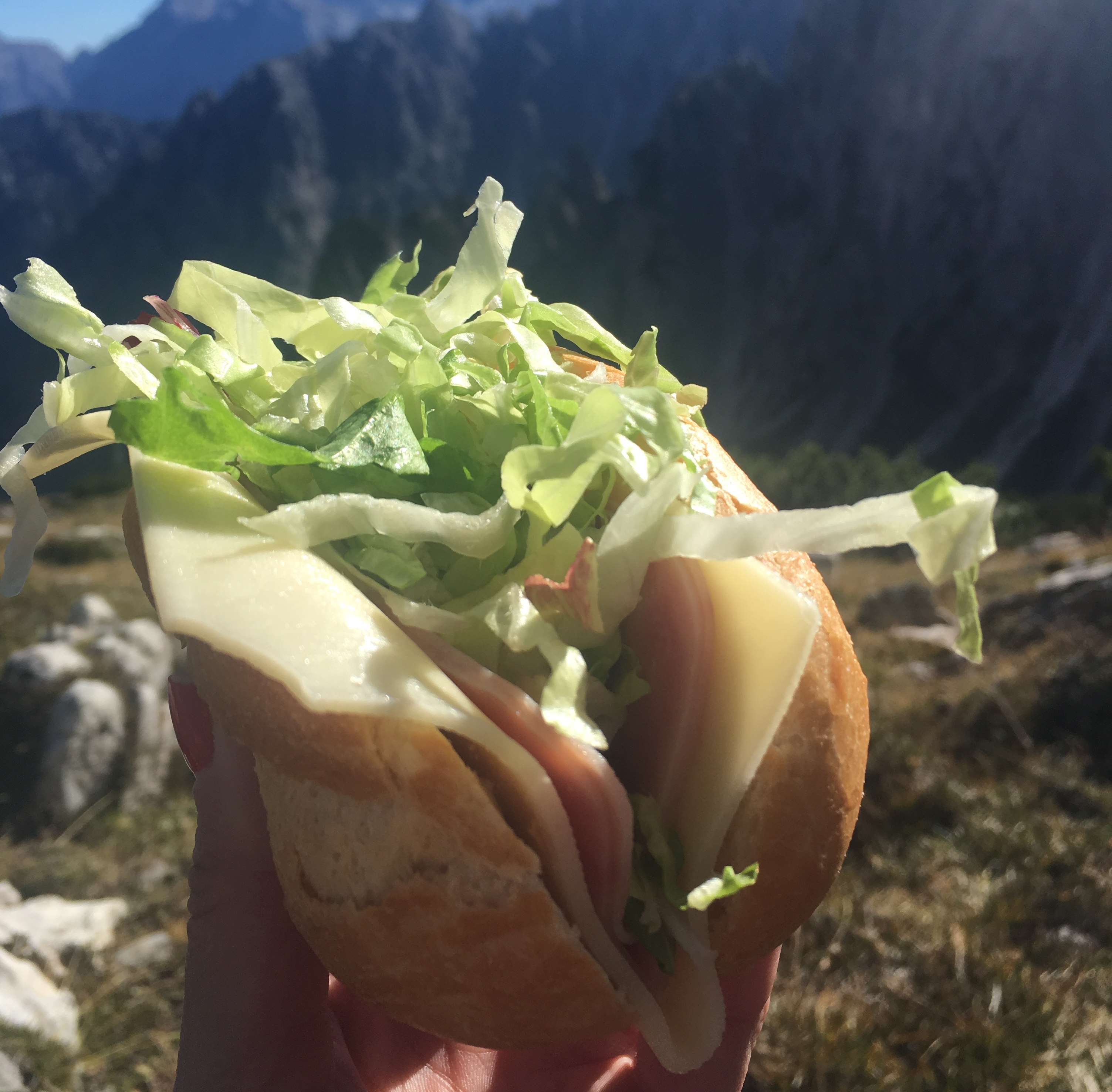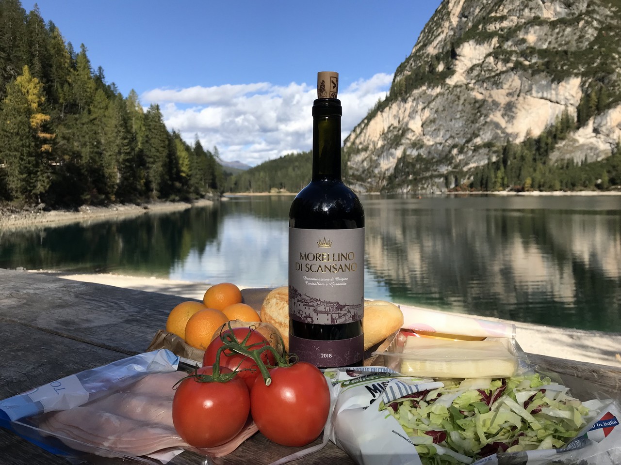 Сытный обед в горах – это отдельная тема. Как же здорово после тяжёлого, или не очень тяжёлого, пешего перехода, открыть бутылочку насыщенного итальянского красного вина, попробовать свежайшую выпечку с прошутто и сыром, провести время с любимым человеком или в кругу друзей!
