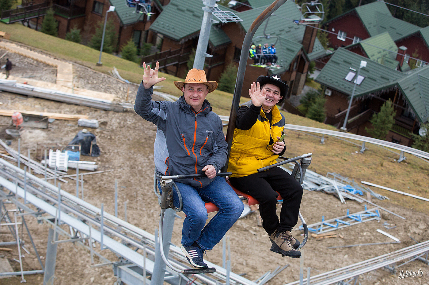 Прямо возле центральной смотровой площадки (подъёмник номер два) устанавливают новый экстремальный аттракцион, который, естественно, также не успели закончить к Новому году. Но никто не переживает. Все понимают: рано или поздно пойдёт снег. А под белым покровом Буковель красив в независимости от количества незавершенных строек и недоработок.