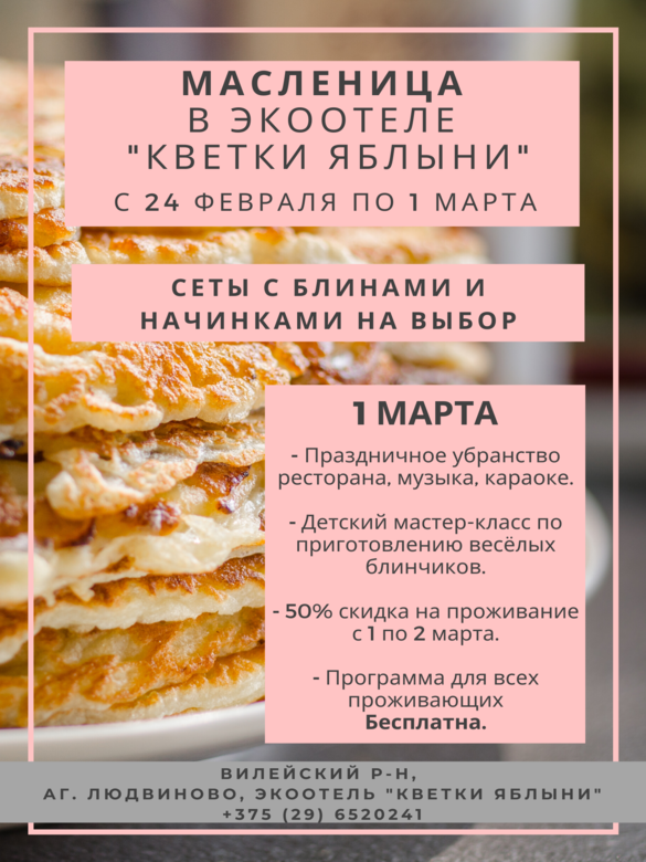 С 24 ФЕВРАЛЯ экоотель "Кветкi Яблынi" рад предложить вам прекрасные блинные сеты. Хотите блины налистники? Пожалуйста! Хотите пухлые мучные? Да не вопрос! |