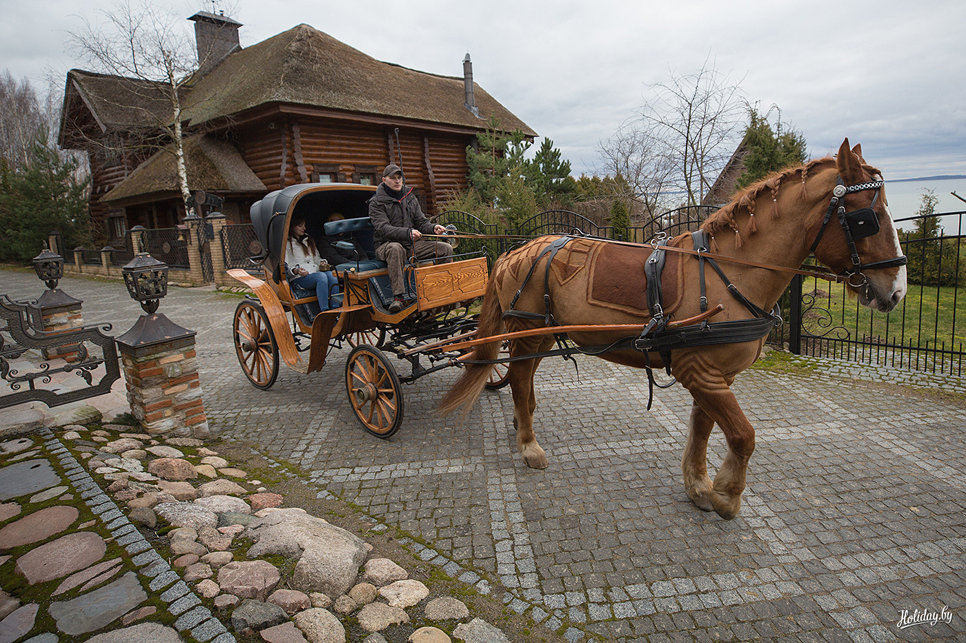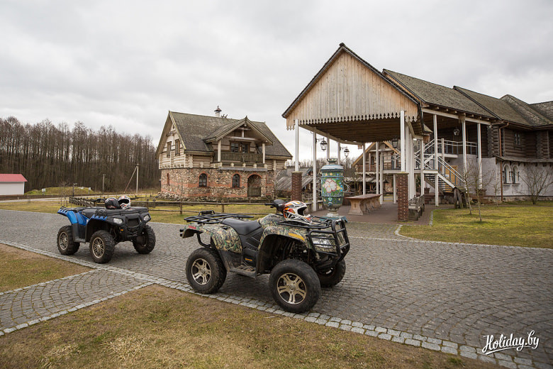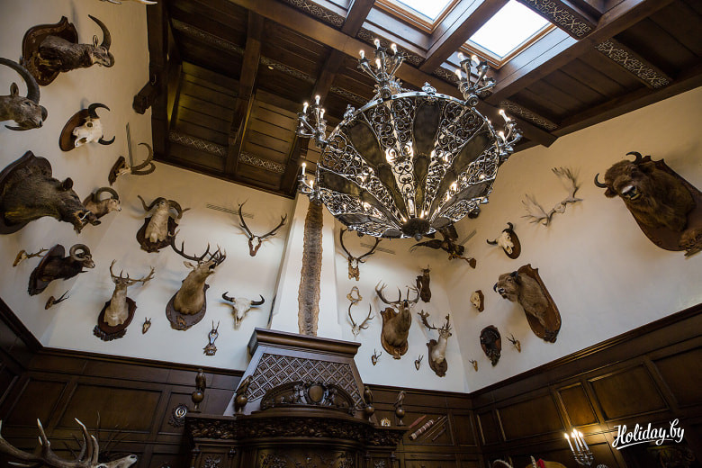 Можно не снимать дом, а приехать только на обзорную пятичасовую экскурсию (для групп — 55 BYN с человека). Есть конюшня, яхт-клуб, квадроциклы, трофейный охотничий зал с камином.