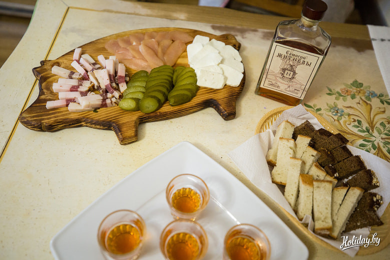 Между делом на столе возникает «бутылёк» того самого фирменного житневого самогона.