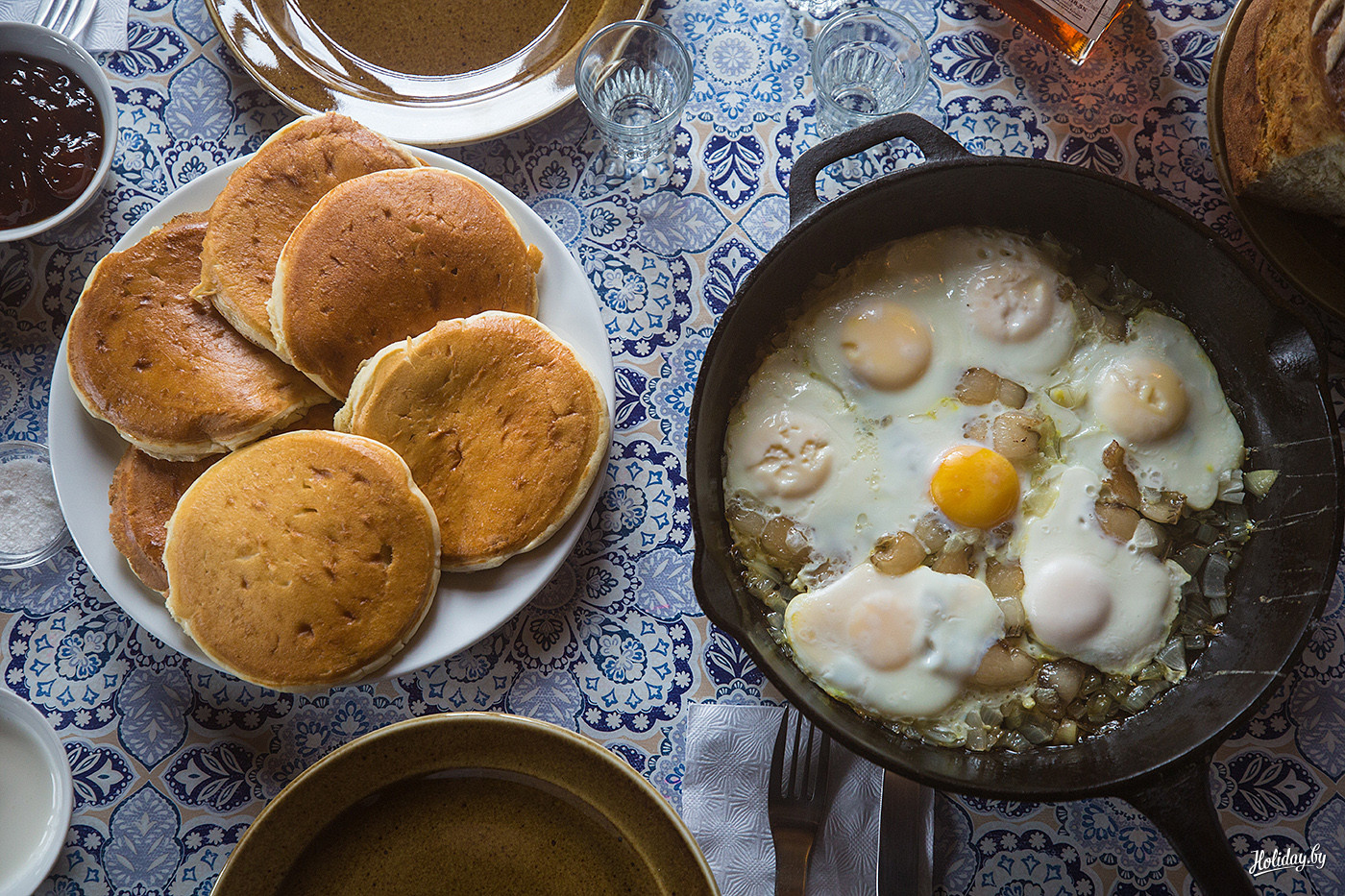 На столе шкварчит (и лучше слова здесь не используешь) яичница с луком и салом. Рядом блины. Их нужно обмакивать в растопленный жир, потом в сметану. На десерт — чай с вареньем.