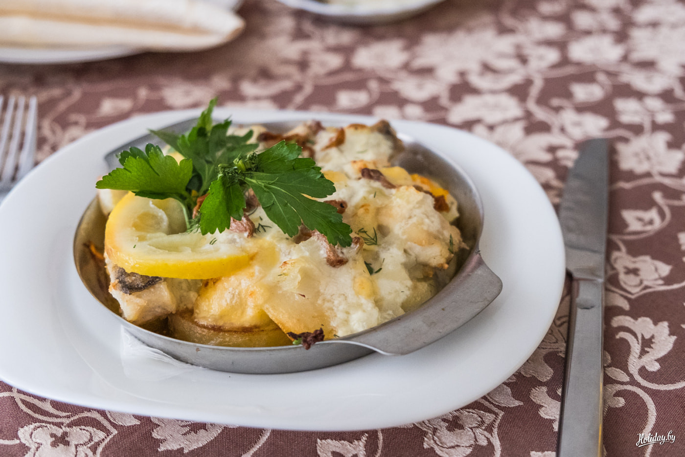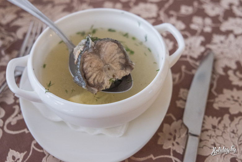 На обед ставка была сделана на уху с угрём и жареную рыбу с картофелем и овощами. Уха отличная, а второе можно назвать как «очень-очень хорошая школьная столовая». Традиционно для таких заведений блюда мощно сдабриваются майонезом. За рыбный обед отдано 15,76 BYN (около 6,5 USD).