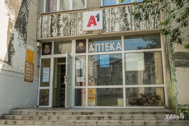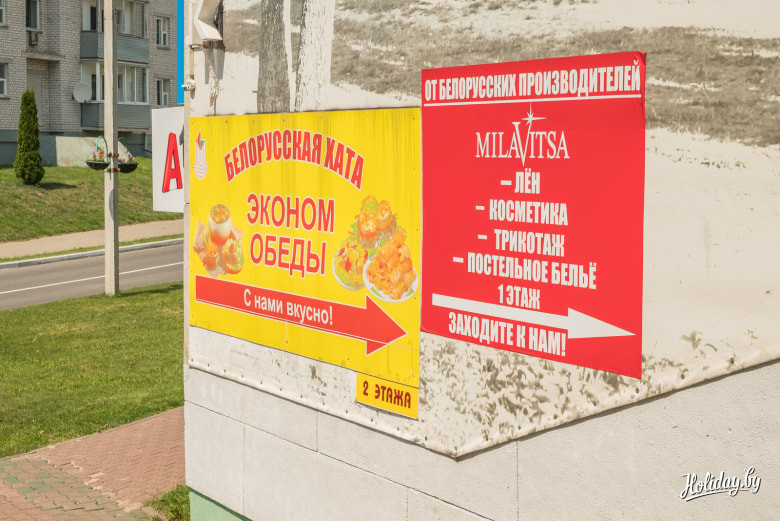 Заметно, что курорт Нарочь до сих пор живёт в ожидании туристов из России. Настолько активной рекламы белорусского трикотажа я нигде не встречал. Зашёл в один из «торговых центров» по ул. Ленинской, 14. Заодно обнаружил аптеку и обменный пункт – это важно.