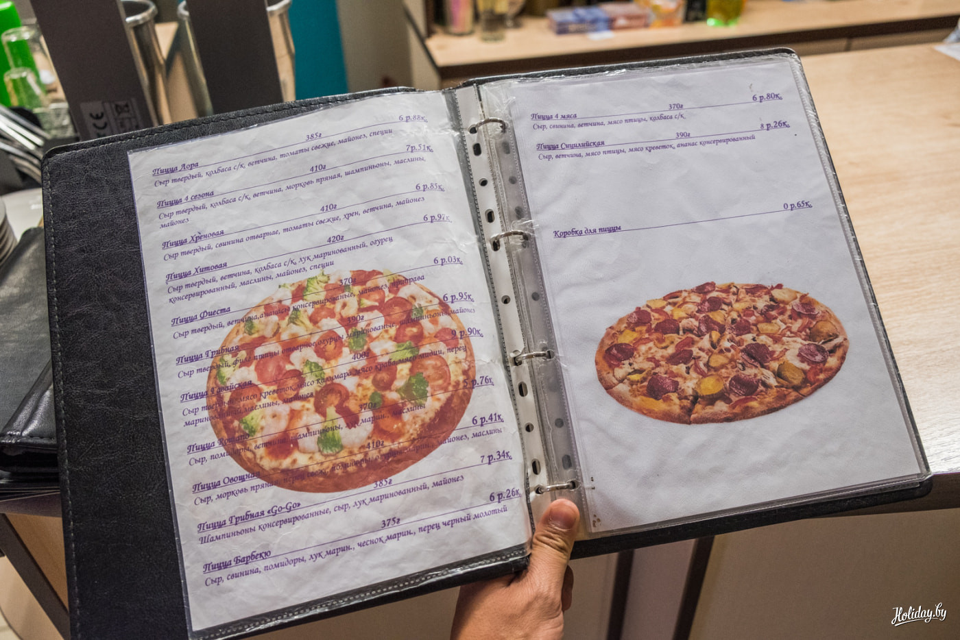 Пицца готовится при посетителях за минут 20-30 и представляет собой «смажень плюс». Средняя цена пиццы 6,5 BYN (примерно 2,6 USD). Можно заказать на вынос.