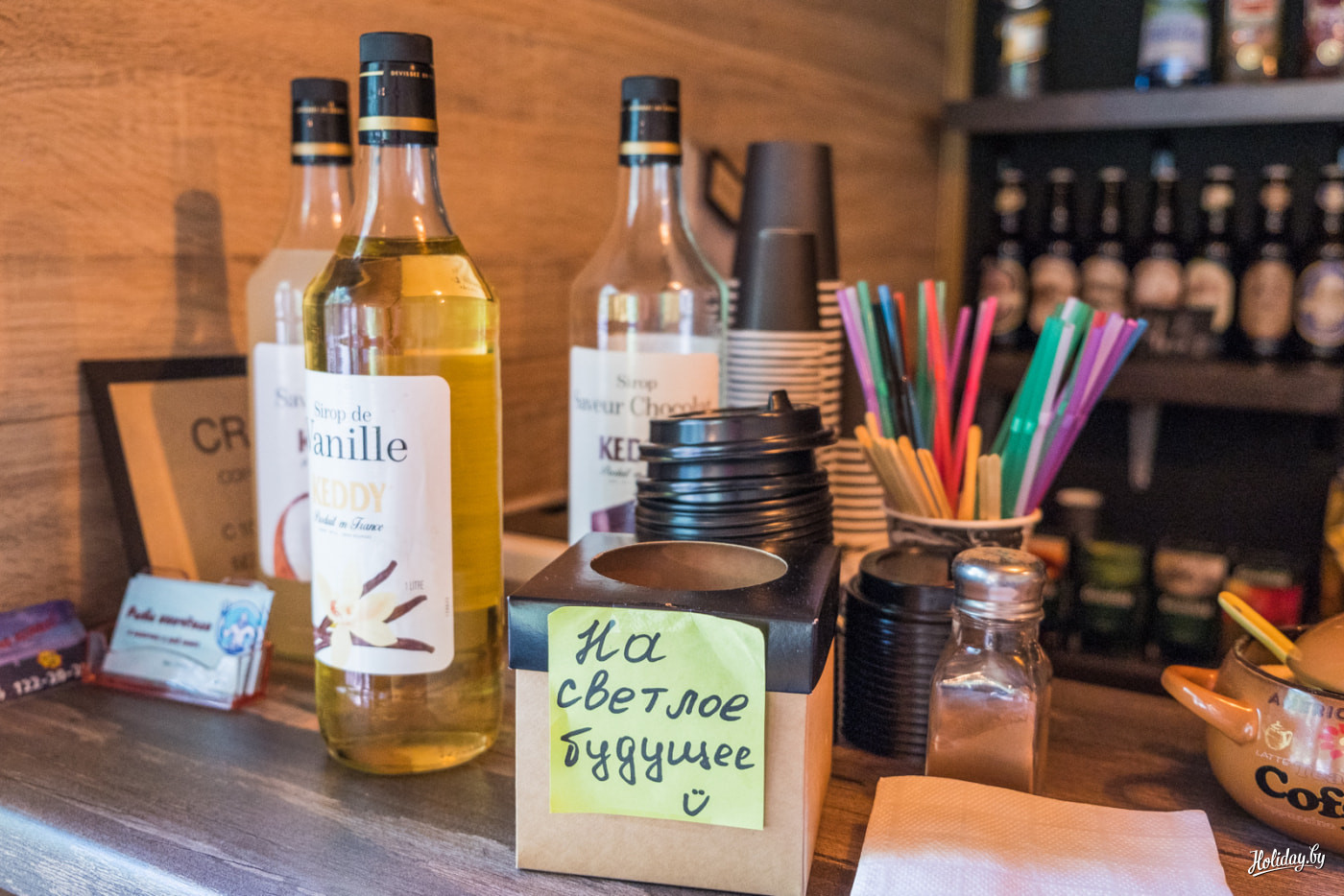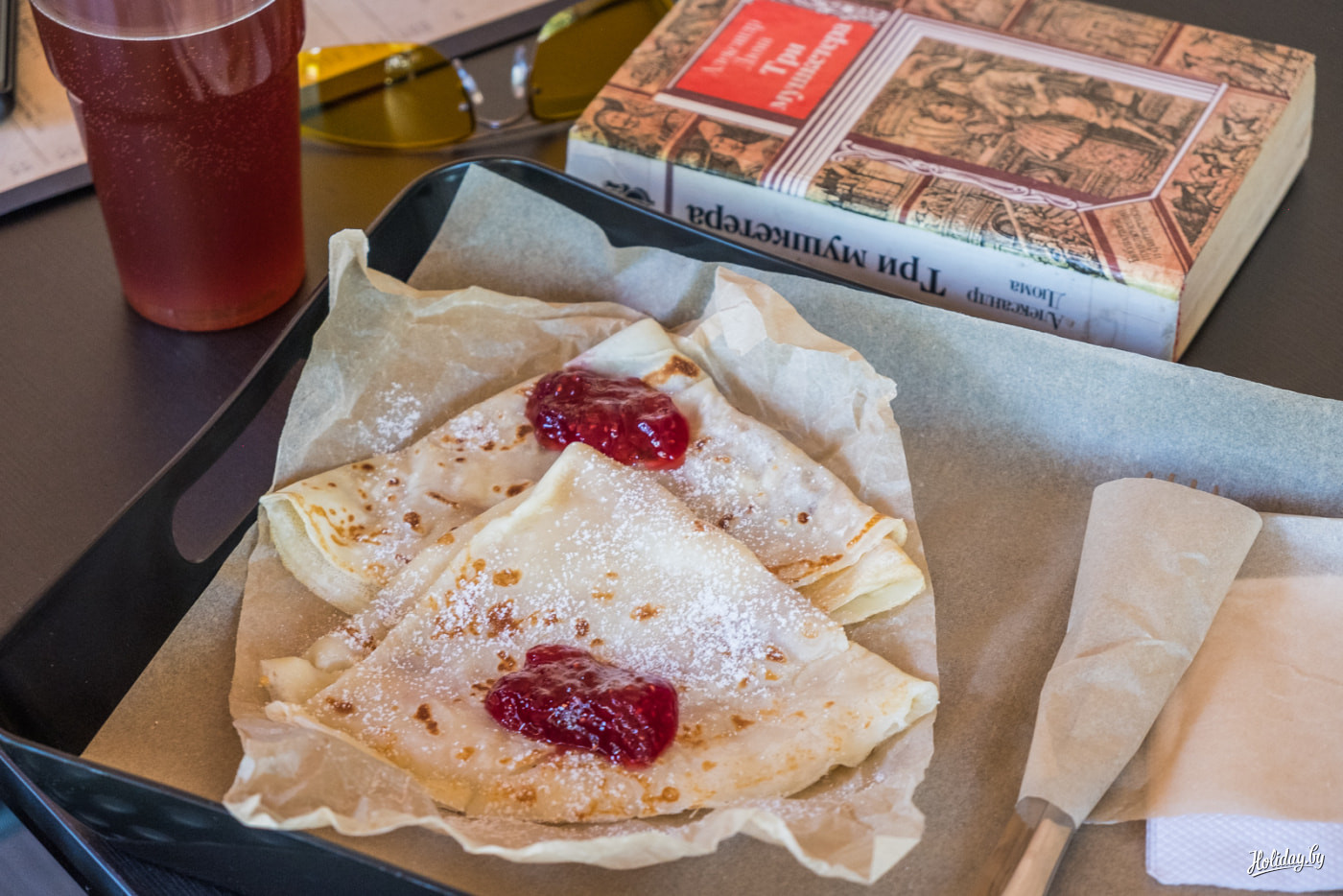 Тут хороший кофе из кофемашины, отменные домашние блинчики с вареньем и бочковым квасом (на фото за 6 BYN или примерно 2,5 USD). За соседним столиком пара заказала драники и была очень довольна едой.