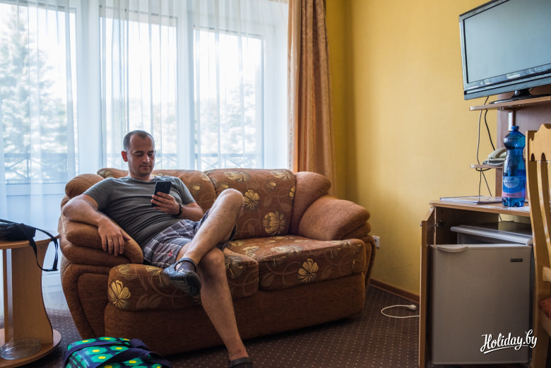 Разместились в двухкомнатном двухместном «Люксе» по цене 103 BYN (примерно 43 USD) за ночь. Остались на две ночи и доплатили сверх 206 рублей ещё по паре рублей за сутки курортного сбора.