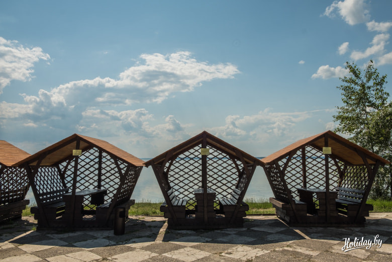 Место потребления сосисок в тесте, беляшей и шашлыка – с видом на миллион долларов. Отдельные беседки смотрят на огромное зеркало озера Нарочь.
