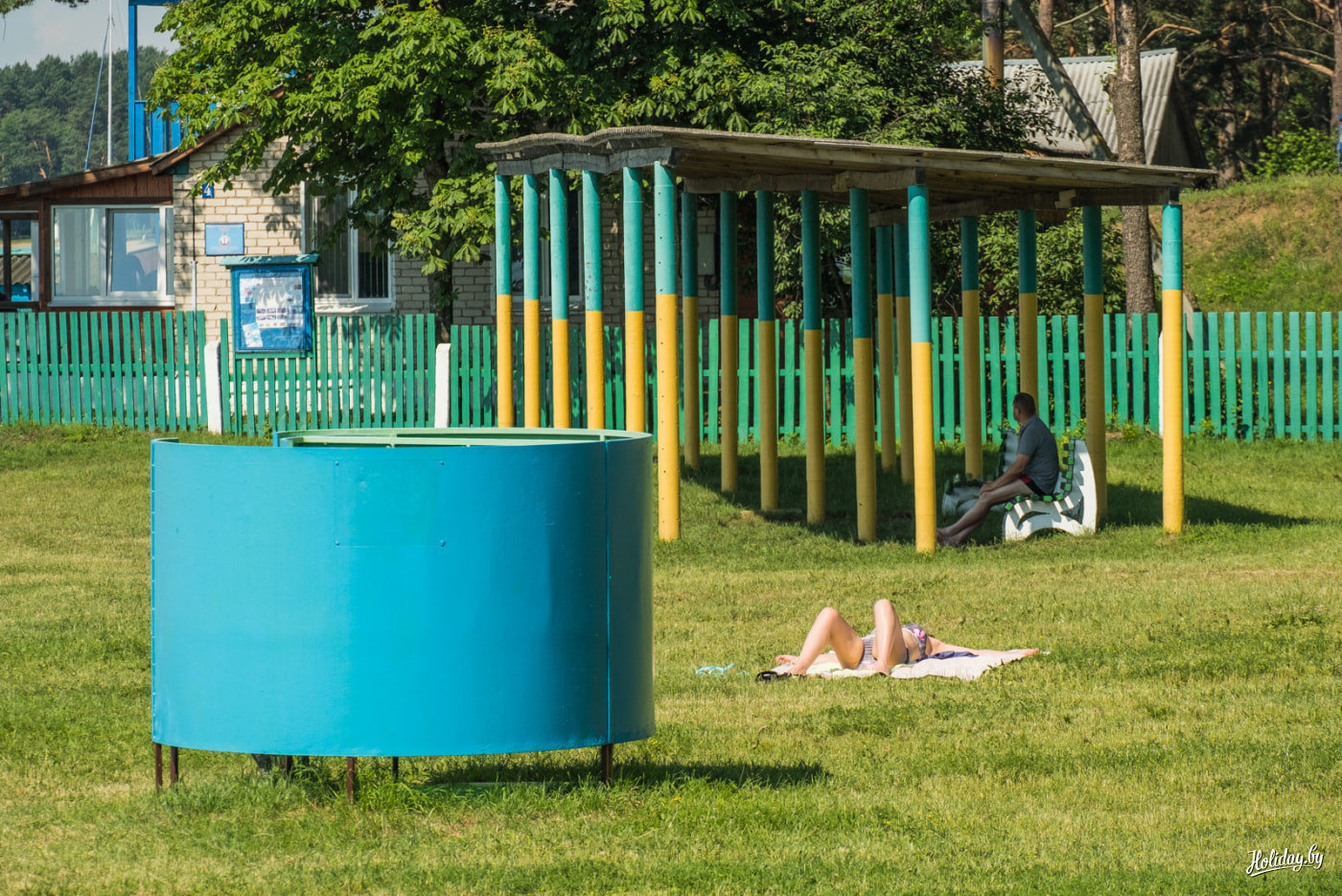 Есть пару стационарных зонтиков, но по сути – это большая поляна, выходящая к воде. Большое здание напоминает вышку спасателей, но это не точно.