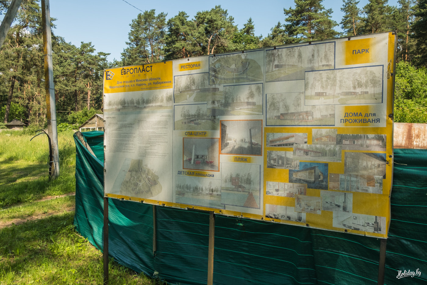 Или как она могла выглядеть. Если двигаться от автобусной остановки, то справа и слева от дороги можно найти плакаты 2013 и 2017 года. На них Нарочь не узнать – крутой дизайн мини-коттеджей, парки, зоны активного отдыха, СПА-центр.