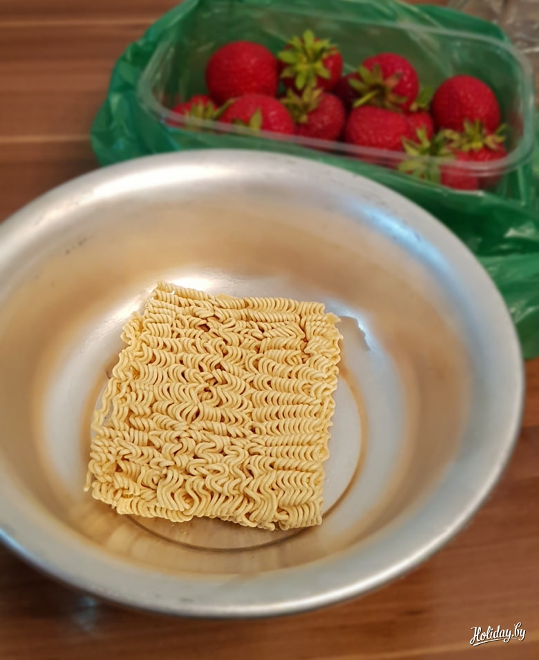 Так выглядит поздний ужин в Лиде, если ты привёз берестовицкую клубнику, купленную в Гродно и на рецепции купил лапшу и попросил чайник. Национальная туристическая кухня.