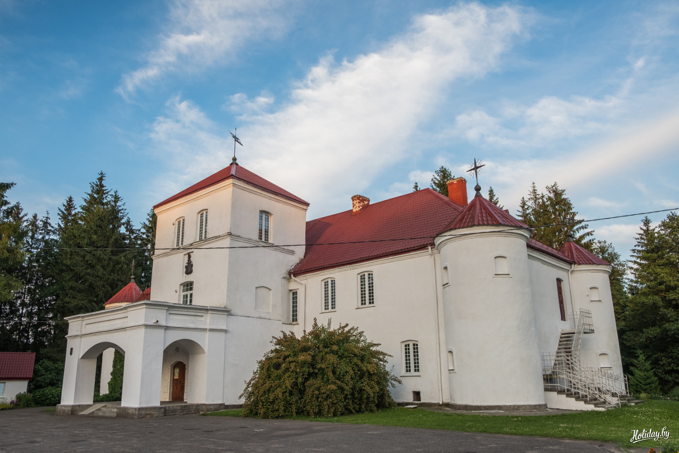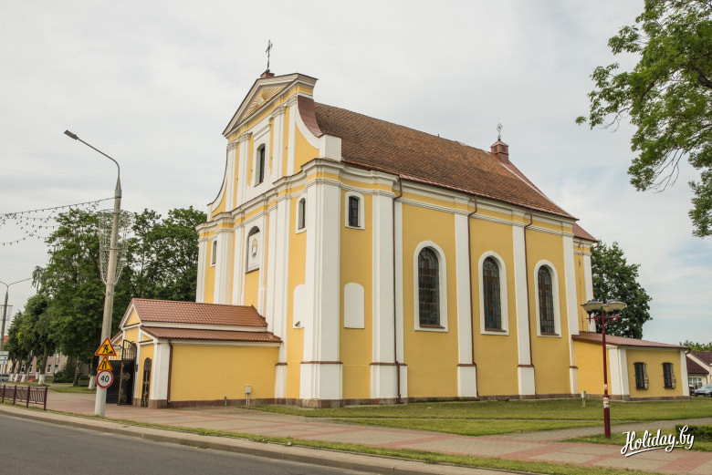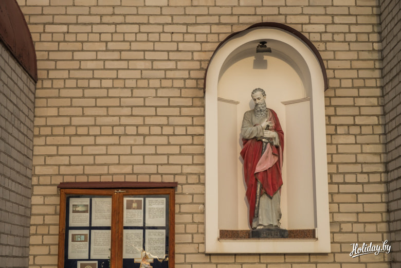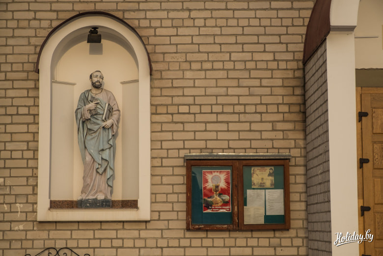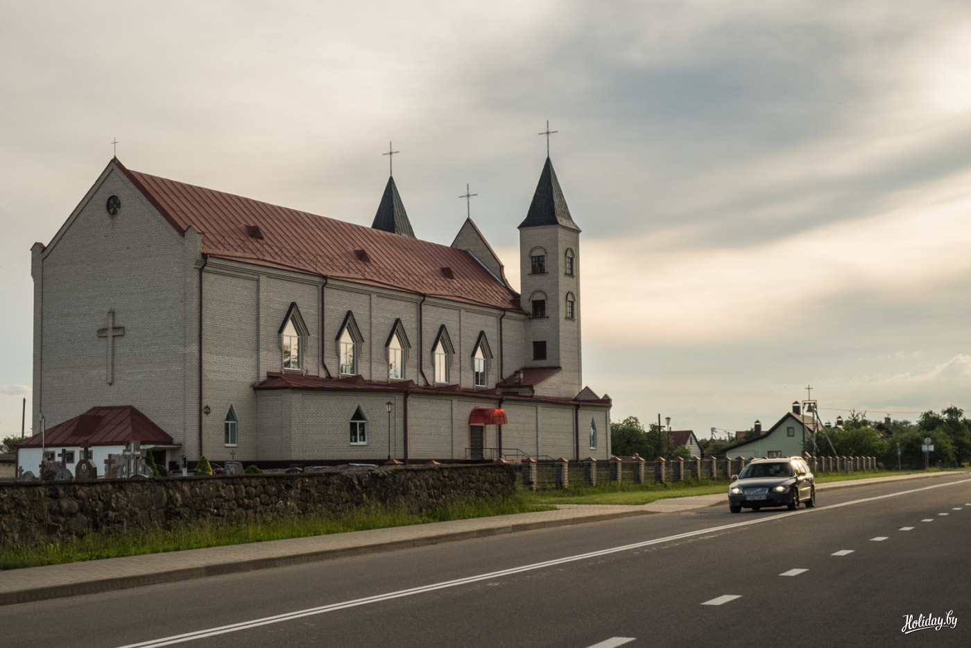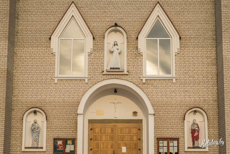 В райцентре соседнего района – в городке Вороново – можно найти необычный костёл. Он современный и фактурный. Самое интересное на фасаде – это скульптуры святых и блаженных.