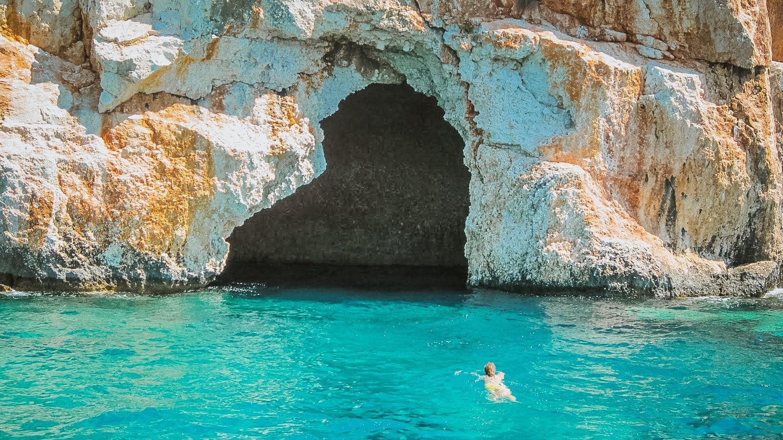 - Внутри пещеры – небольшой пляж из гальки и песка, бирюзовое Средиземное море.