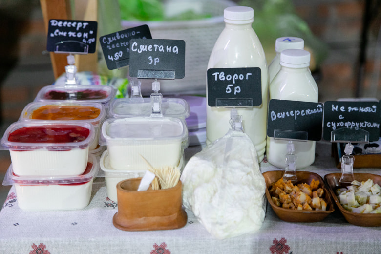 Продукция продается напрямую без торговых надбавок. Выдержанные сыры стоят от 27 до 30 рублей за кило, а молодые, вроде брынзы или адыгейского, отдают за 20. Полкило домашнего творога предлагают за 5 рублей, во столько же оценили 100 грамм бастурмы. Сало расходится по 14 рублей за кило, шпик – по 10, колбаса – по 28. Полкило козьей тушенки обойдется в 10 рублей.
