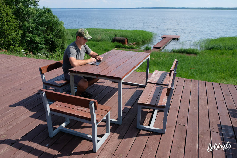 Доплатили за завтраки, парковку, тут же отведали драники с холодником и растянулись на собственном пирсе озера Навята.
