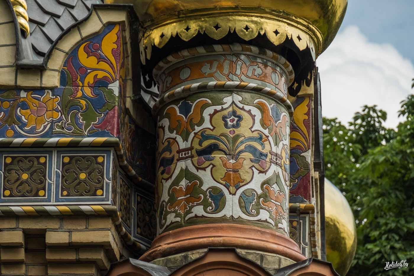 Притягивают взгляд керамические колонны под позолоченными куполами, а также обилие майоликовой плитки с причудливыми узорами, в которых легко угадываются древнерусские мотивы.