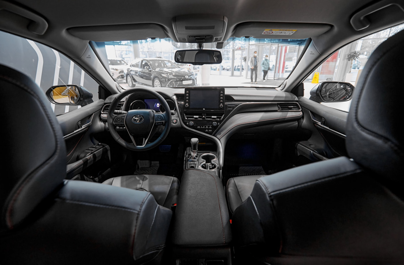 Просторный салон обновленной Toyota Camry, позволяющий комфортно разместиться и водителю и пассажирам, передовые технологии, мультимедийная система с поддержкой Apple Carplay© и Android Auto© позволят наслаждаться каждой минутой своего пути.