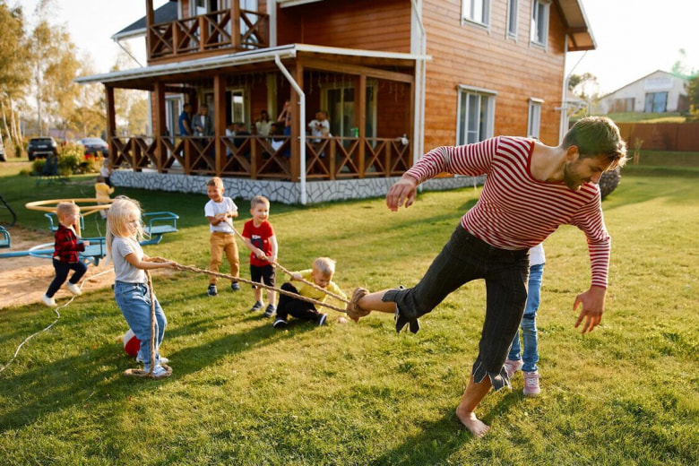 Чем в усадьбе могут заняться ДЕТИ и взрослые: гости найдут множество развлечений как в доме (караоке, настольный футбол (киккер) и т.д.), так и на открытом воздухе: от игр с мячом и дартса, до перетягивания каната, бадминтона, городков, бочи, развлечений на детской площадке (качели, горка), боев с подушками на бревне и колодках, рубке дров на скорость, соревнований в ловкости на ходулях и пеньках и т.д.