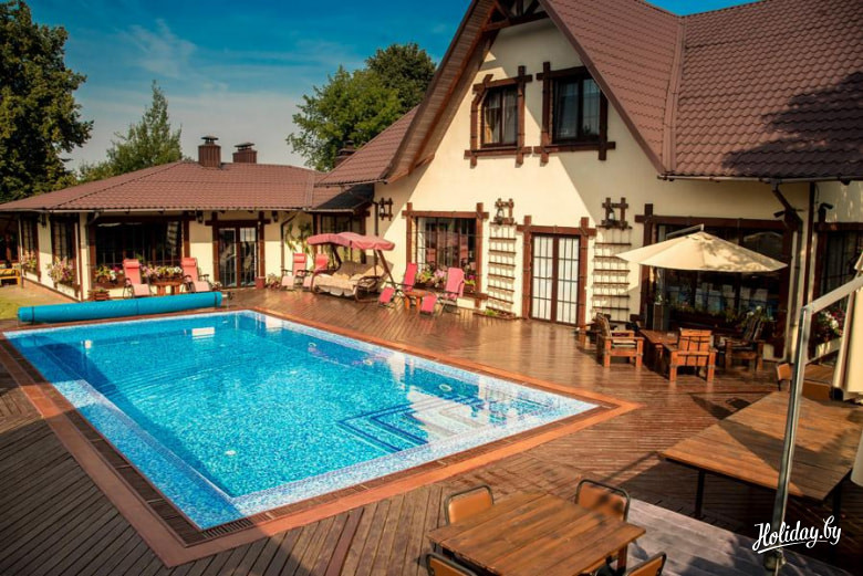 "Добра хата" - уютная благоустроенная усадьба, с современной отделкой и авторским дизайном интерьера и экстерьера. Расположена в сельской местности в 20 км от Минска вблизи спортивного комплекса Раубичи в центре большой и самой обыкновенной белорусской деревни. Территория усадьбы в 3500 кв.м. отлично благоустроена. Есть парковка и множество уютных уголков для отдыха и развлечений: розарий, альпинарий с каскадом и прудом, фруктовый сад с беседкой, печью-барбекю и летней кухней, качели, водопад, кострище, шалаш. Для маленьких гостей имеется трехуровневый детский городок.