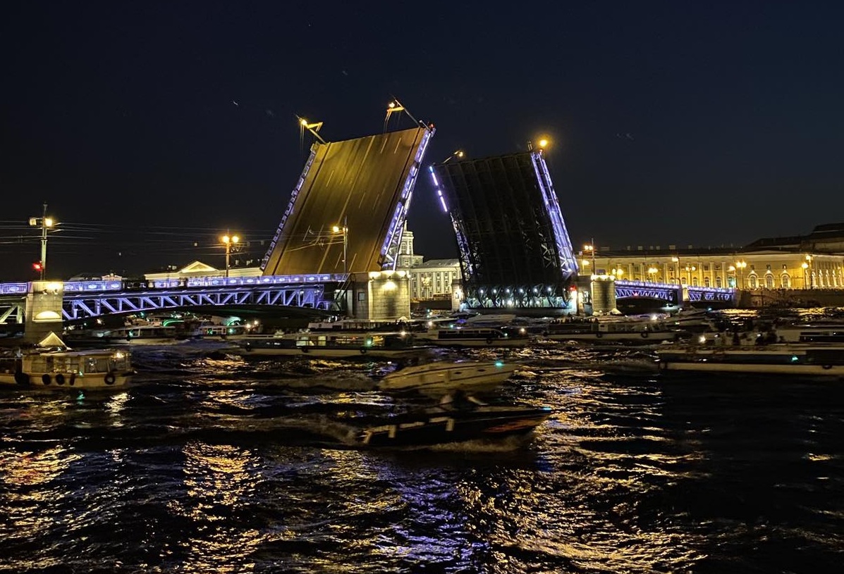 Визитная карточка Питера - разводные мосты, всего их двенадцать. Первый развод мостов начинается в 01:10 и это Дворцовый мост, который является соединяющим звеном между центром Петербурга и Васильевским островом. Здесь играет классическая музыка, что помогает полностью насладится зрелищем.