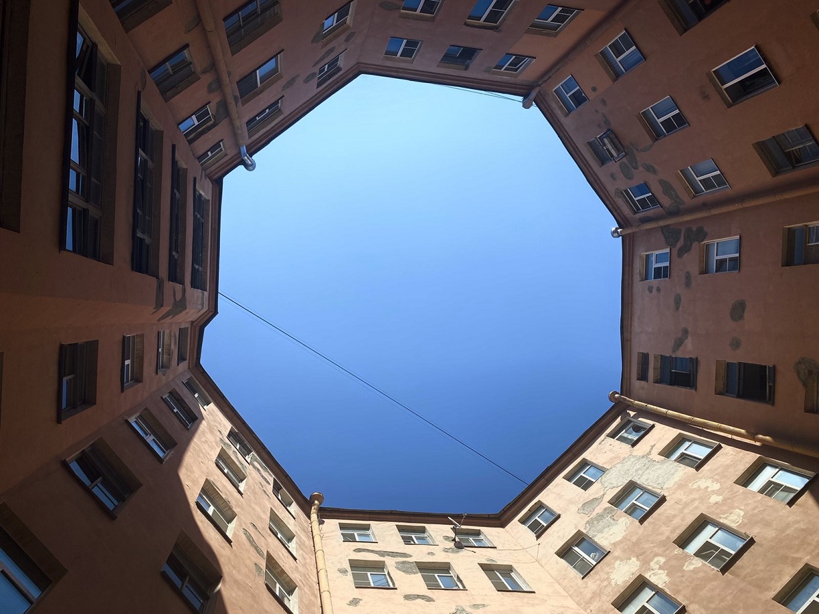 Двор-колодец на Малом проспекте Петроградской стороны известен многим. Его отличительная черта — восьмиугольник, который вы увидите, подняв голову. Возможно, такая форма связана с восьмиугольной мальтийской звездой.