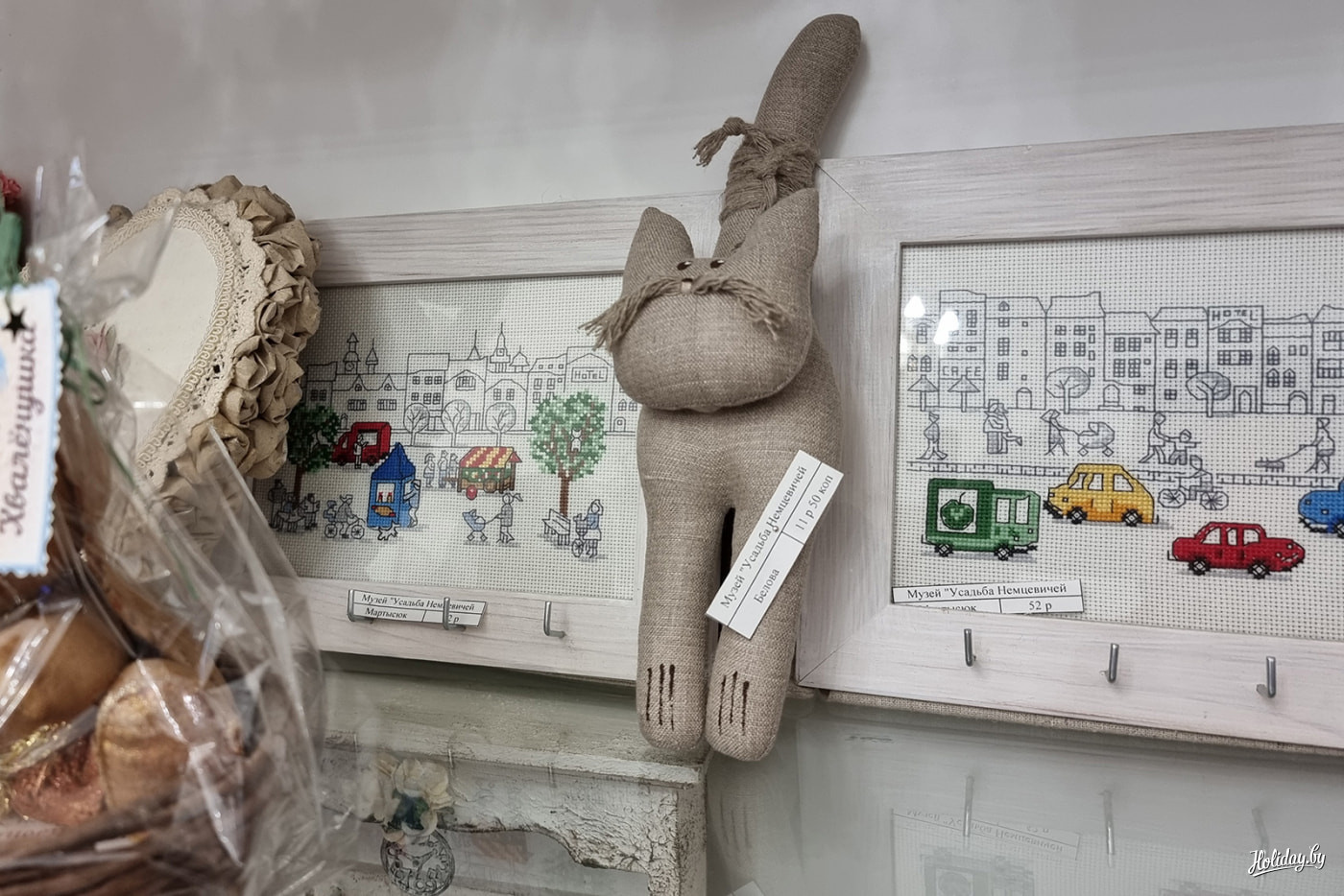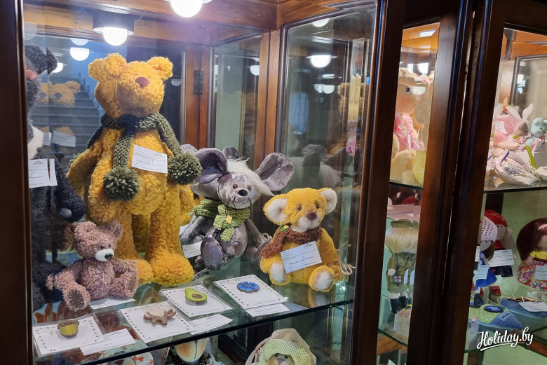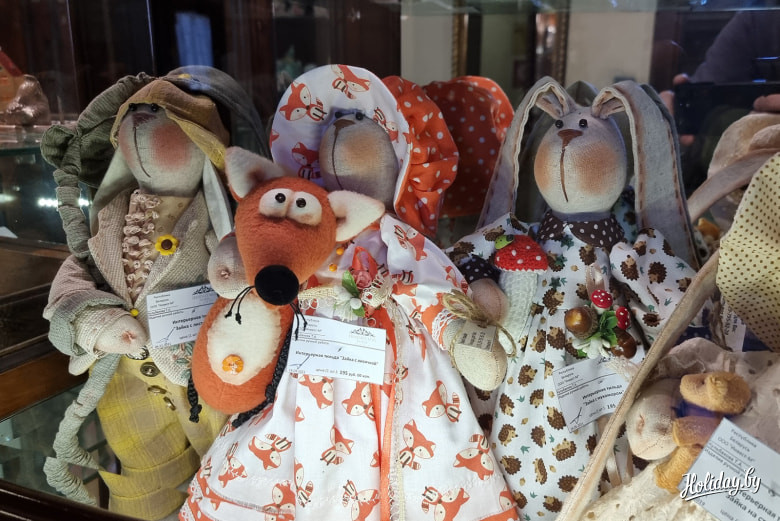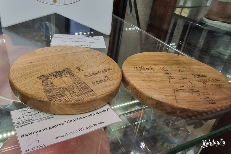 В отеле «Эрмитаж» в Бресте на первом этаже можно найти несколько точек с сувенирами. Справа от рецепции, у лифта, расположился шкаф, в котором много классных поделок. Здесь как бы продолжается концепция всего отеля, когда местные мастера могут через отель предложить свои изделия туристам.