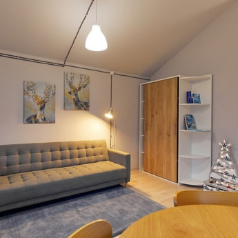 В домике - комната с двуспальной кроватью для родителй, отдельная комната с односпальной кроватью для ребенка, а также общая гостевая зона с удобным диваном и оборудованным кухонным уголком. На кухне - мини-холодильник, СВЧ печь, электрический чайник, индукционная плита и полный комплект посуды для готовки и приема