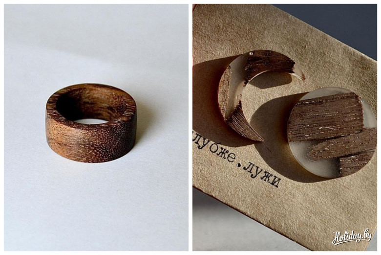 Далее в нашем списке - украшения из дерева от бренда Глубже Лужи. Они изготавливают вручную серьги и кольца из редких пород дерева. Например, кольцо из фактурного натурального дерева или серьги "Солнце и Луна" из ювелирной смолы и ломаной древесины американского ореха. glubzhe.luzhi_ #украшенияручнойработы