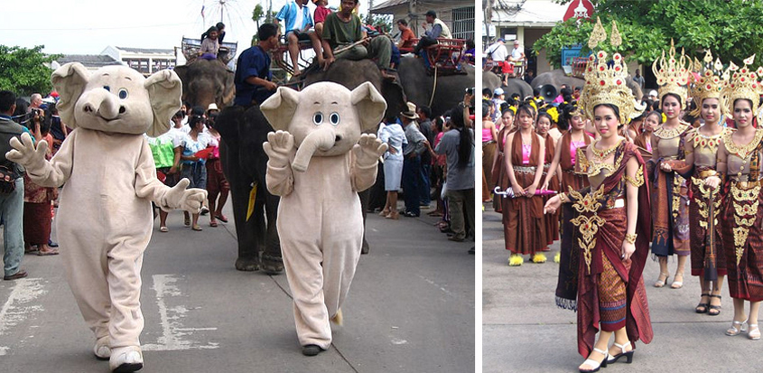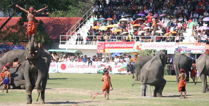 Так, ежегодно в ноябре (даты постоянно меняются) в 430 км к северо-востоку от Бангкока в небольшом городке Сурин проходит фестиваль слонов. Все слоны в этом городе с самого рождения обучаются опытными дрессировщиками – махаутами, которые проживают в деревне Тай Клонг в 40 км к северу от Сурина.