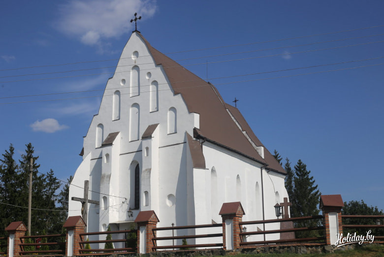Вдоволь напившись крыничной водицы, мы вернулись к костёлу, который как снаружи выглядит просто «шыкоўна» – стиль белорусская готика, 1472 года постройки.