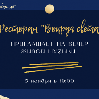5 ноября в 19:00 в ресторане "Вокруг света" начнётся бесплатная развлекательная программа для наших гостей. Для всех любителей провести вечер под приятную живую музыку выступит певица Ольга Синкевич. А сотрудники ресторана "Вокруг Света" позаботятся, чтобы под душевную музыкальную программу, вы наслаждались изысканной едой и вкусными напитками.