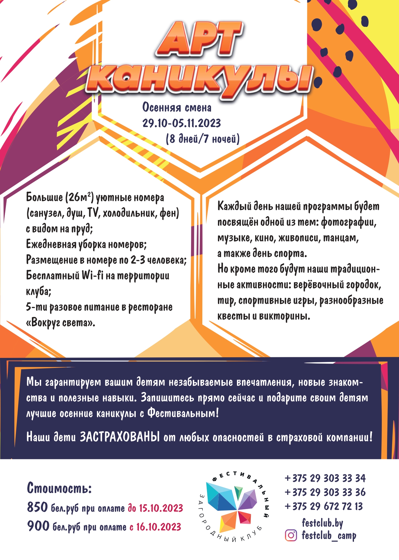 С 29 октября по 5 ноября 2023 приглашаем школьников 9 - 14 лет провести осенние каникулы в «Фестивальном».