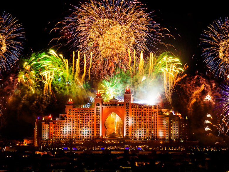 Традиционно у самых популярных достопримечательностей эмирата устраивают красочные шоу фейерверков. В этом году у небоскреба Burj Khalifa пройдет грандиозное лазерно-пиротехническое шоу. Удобнее всего наблюдать за новогодним представлением из соседних ресторанов или с променада Dubai Fountain рядом с ТРЦ Dubai Mall (приходите пораньше, чтобы успеть занять лучшие места). Кроме того, гости города смогут полюбоваться праздничным фейерверком на острове Bluewaters, на площади у торгового центра Dubai Festival City Mall и на курорте Atlantis The Palm.