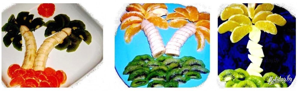 Если вы не любите маслины, но идея пальмы понравилась, можете просто уложить кусочки фруктов так, как на картинке. Так будет даже быстрее и проще.
