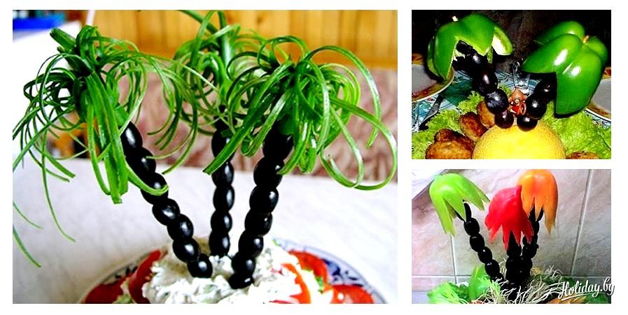 Способ приготовления: нарежьте перья зеленого лука лапшой (надрезы делайте не до конца). У вас получатся своего рода юбочки, соедините каждые три, вставляя их одна в одну. Для того, чтобы «юбочки» были более пышными, окуните их в теплую воду. Далее, на каждую шпажку для шашлыка нанизываете оливки (без косточек), сверху «надеваете» зеленый лук. Стволом пальмы могут послужить и трубочки для коктейлей. Но для того, чтобы они были устойчивыми, лучше надрезать их основание по диагонали.