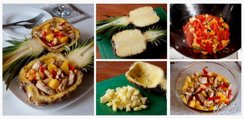 Способ приготовления: ананас нужно разрезать вдоль пополам. Вырезать мякоть так, чтобы половинки ананаса стали «чашами». Мякоть же нарезаем маленькими кусочками. Цветную капусту разрезать на кусочки. Перец нарезать соломкой. Лук крупно нарезать. Филе индейки нарезать на кубики. Сначала поджарьте цветную капусту, затем добавьте лук и перец. Отдельно пожарьте филе индейки (в течение 4-х минут). Смешайте в салатнике кусочки ананаса, филе, цветную капусту и сладкий перец. И выложите смесь в каждую из половинок ананаса. Салат полейте смесью сока ананаса и рисового уксуса.