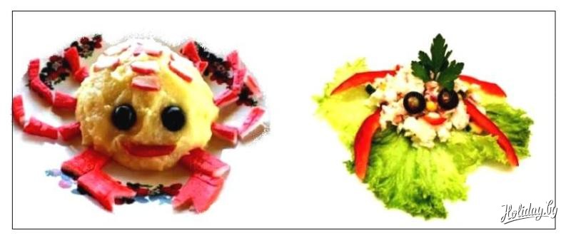Способ приготовления: отварите картошку, сделайте пюре. В центр тарелки выложите порцию картофельного пюре, в форме полушара. Одну крабовую палочку нарежьте кружочками и положите на «туловище». Разрежьте крабовую палочку вдоль по пополам, положите каждую половинку срезом вниз, разрезать на 2 части. Затем, каждый получившийся прямоугольник разрезать на две части по диагонали. Приставить эти клешни к туловищу. Возьмите еще одну крабовую палочку и разрежьте вдоль пополам. Затем, каждую половинку разделите на 4 части, каждый получившийся кубик разрежьте по диагонали. Эти кусочки будут ножками. Кусочки стебля петрушки (или укропа) поместите в пюре туда, где должны быть «глаза». На эти стебельки наденьте оливки без косточек. Нарисуйте ротик ножом.