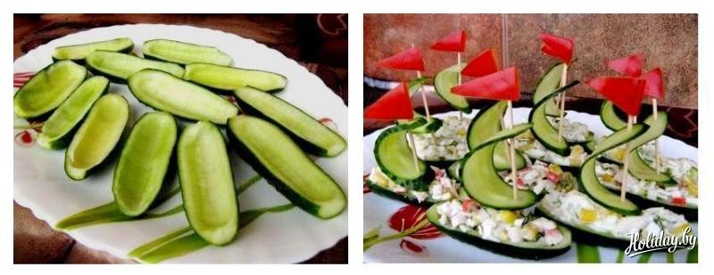 Способ приготовления: разрежьте огурцы вдоль пополам, удалите середину ложкой. Для того чтобы ваши кораблики были устойчивыми, немного срежьте дно. Далее, начините кораблики любимым салатом. Хорошо подойдут салаты с крабовыми палочками, креветками, кальмарами, копченым мясом, курицей. Нарежьте тоненькие огуречные полоски и треугольники из сладкого перца.