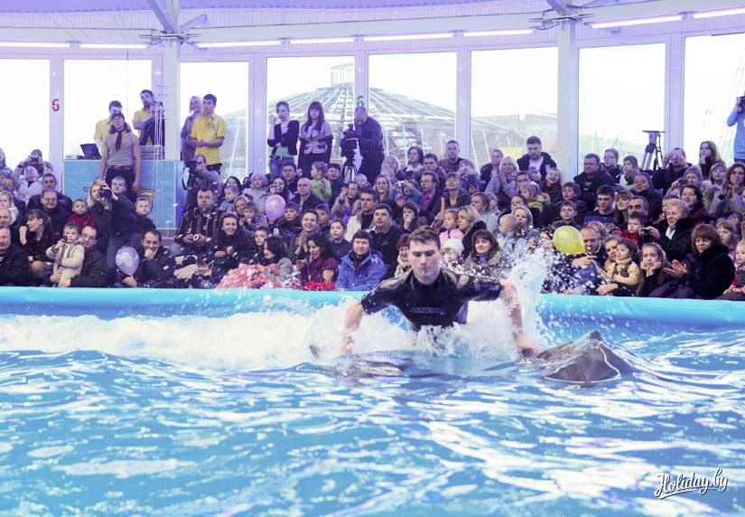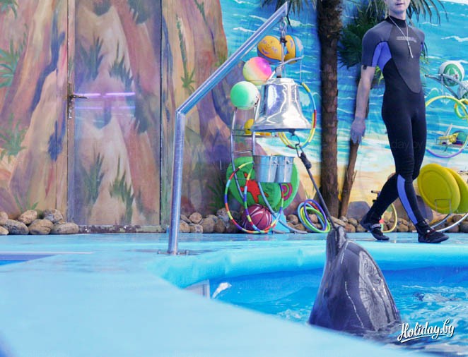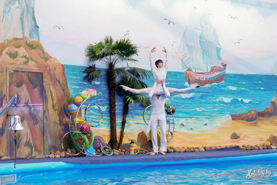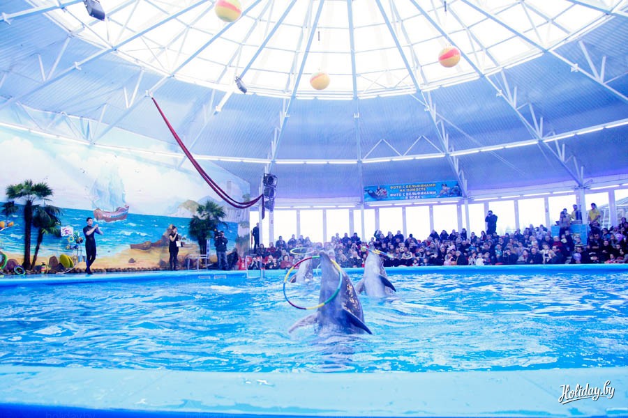 А вот дельфинов всеобщее внимание совсем не напугало. Дельфины в Минске пели, рисовали, танцевали ламбаду в паре, играли с мячами, обручами и в прямом смысле слова вылетали из воды под самый купол дельфинария.