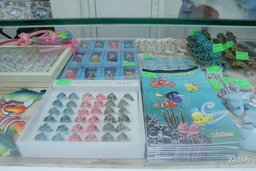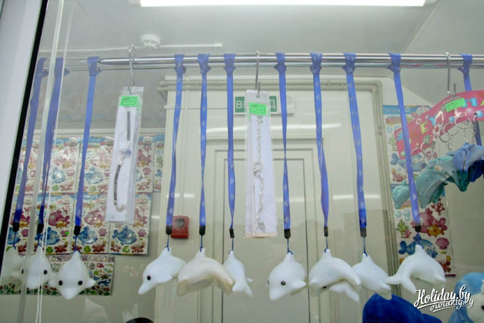 Кстати, о сувенирах – возле кассы у входа в бассейн есть небольшой магазинчик с брелоками, мягкими игрушками, заколочками, книжечками и прочих мелких радостей, которые по понятным причинам представлены в виде дельфинов и других морских обитателей. Стоимость самого дешевого сувенира – 15,000 бел. руб., а самого дорого, который мы заметили, 200,000 бел. руб. – это был браслетик со стразами.