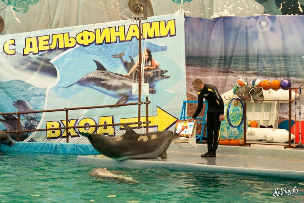 Дельфины поют, танцуют, показывают акробатические трюки и даже рисуют. У каждого посетителя есть шанс стать обладателям уникальной картины, нарисованной дельфинами. Рисунок продается с аукциона – его получает тот, кто готов заплатить большую сумму. Во время нашего посещения картина ушла с молотка за 270,000 бел. рублей.