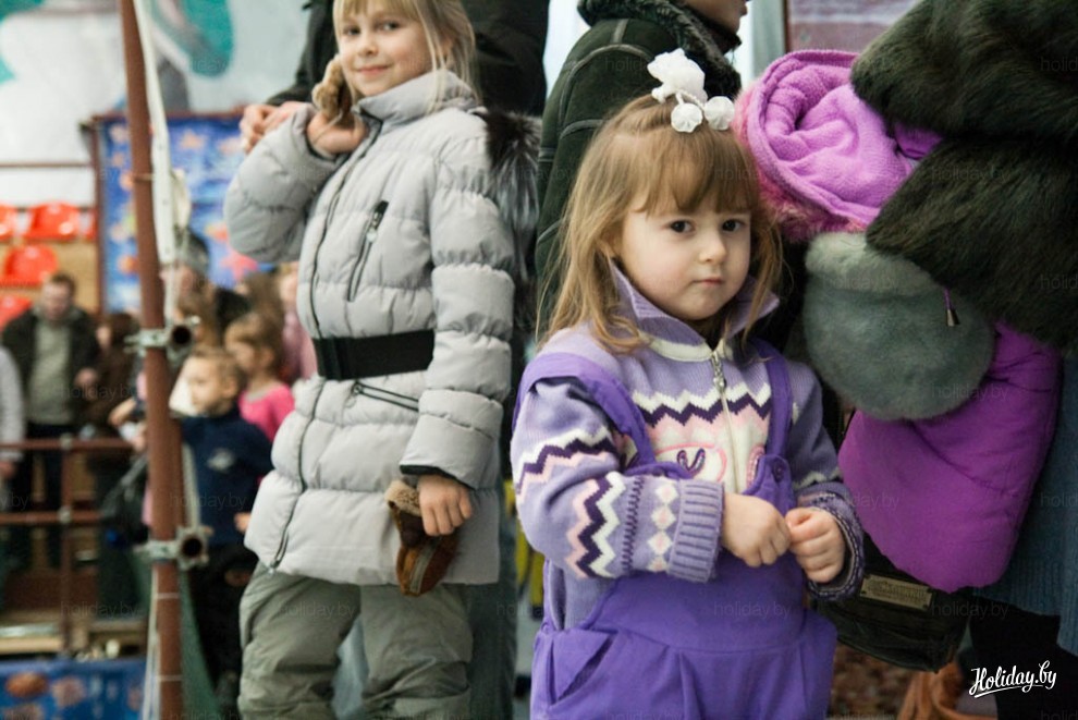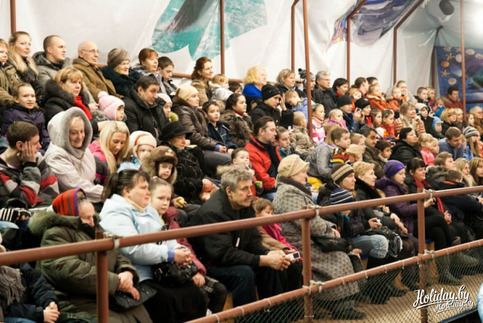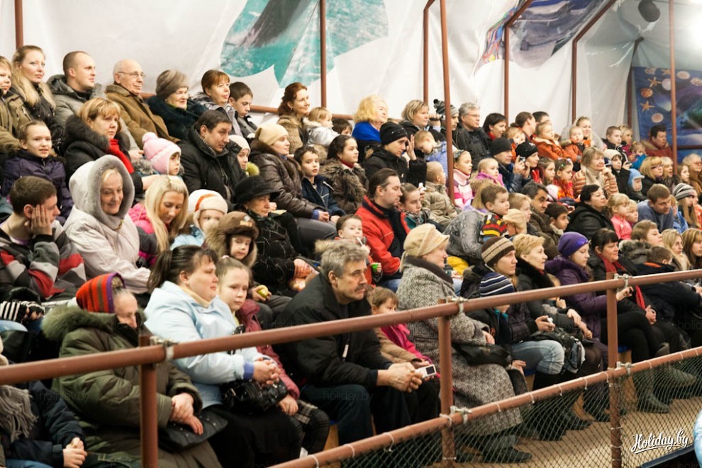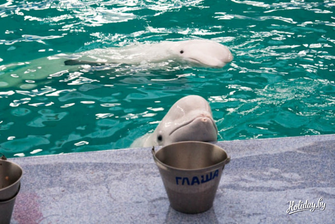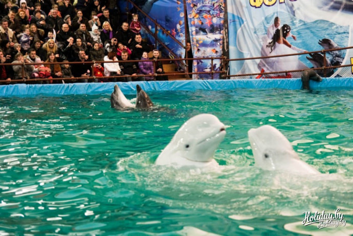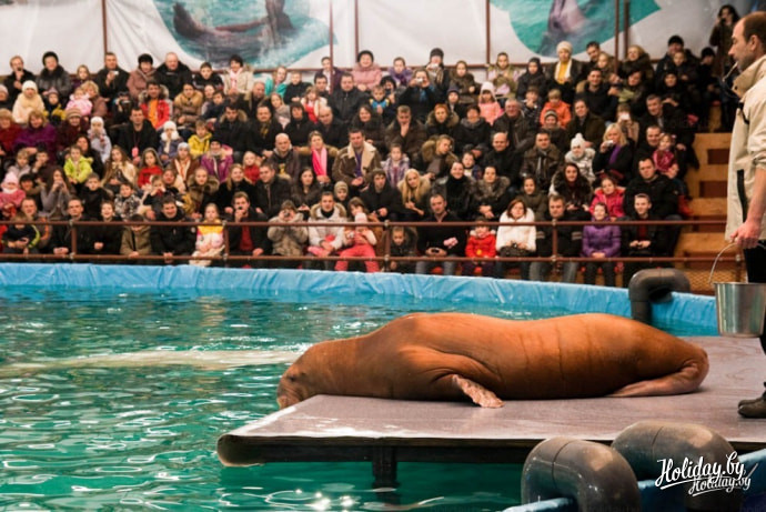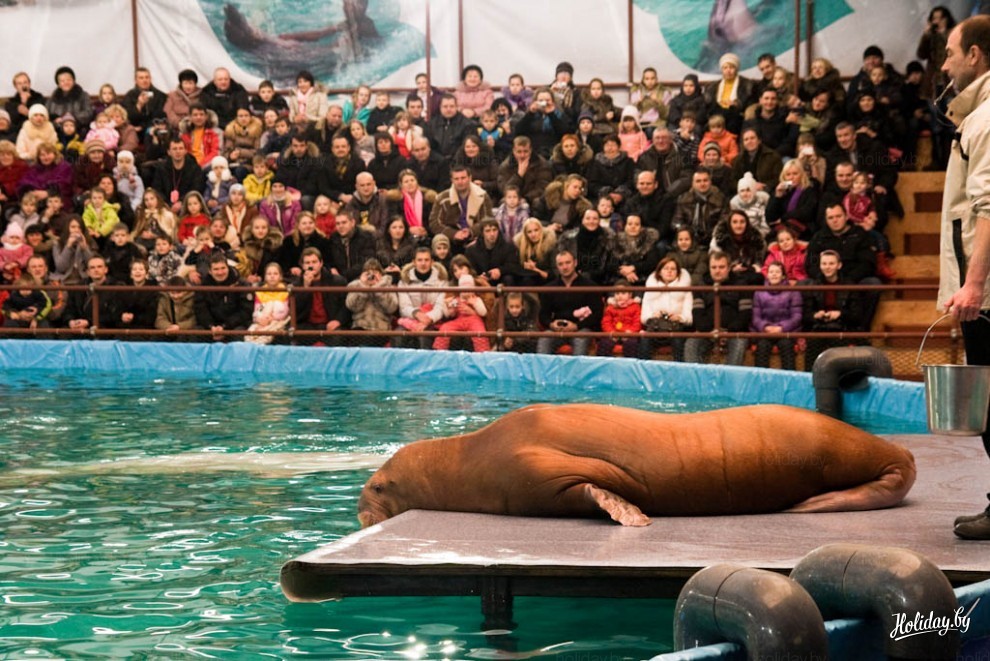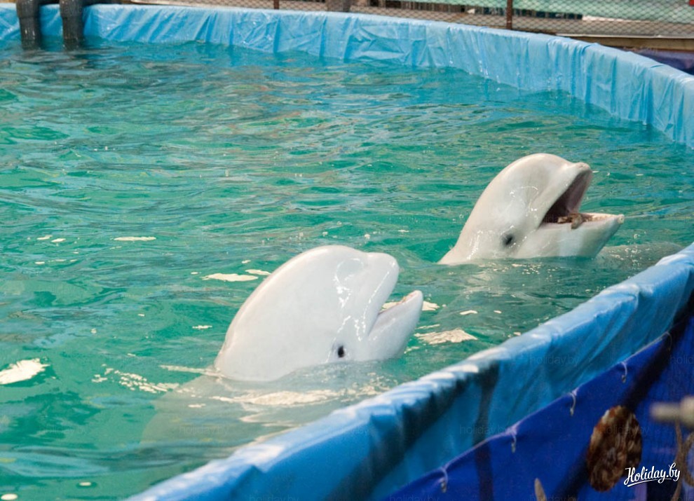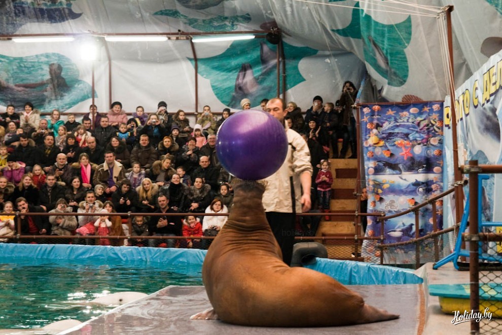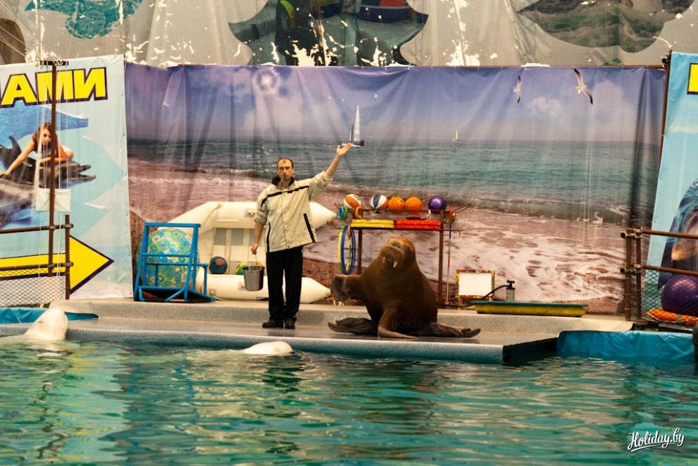 На представление в дельфинарий возле Ледового дворца Минска приглашают два черноморских дельфина-афалина, две белухи и морж. В дельфинарии живет ещё и морской котик, правда в шоу, которое посетили мы, он не участвовал.