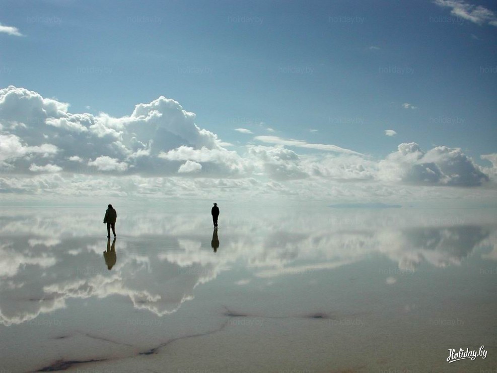 Это не фотошоп, такая картина на самом деле существует в Боливии, неподалеку от озера Титикака и называется Salar De Uyuni (Солёный мир) – бескрайнее соляное озеро. Говорят, что граница неба и земли находится именно здесь!