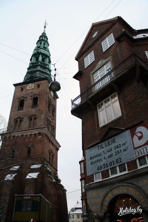 Улица проходит через старую площадь Амагеторв (Amagetorv), за которой находится церковь св.Николая (Nikolajkirke)...