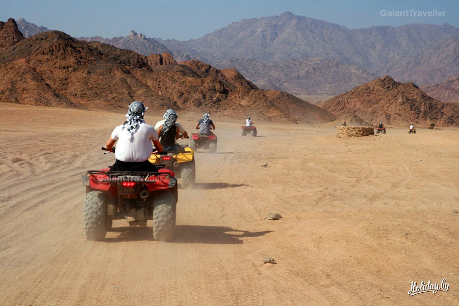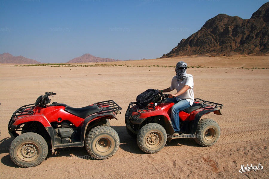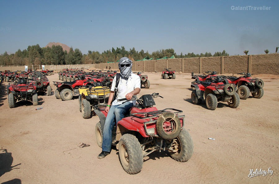 Как мы поняли и стало печально известно из телеканалов - основной вид перемещения туристов - это механический транспорт. На следующей экскурсии у нас был микс из механики и лошадиных сил - прогулка по пустыне на квадроциклах с катанием на лошадях. Незатейливо, но интересно. Главное, чтобы машины попались в исправном состоянии.