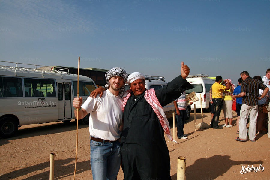 Апогеем туристического гостеприимства Египта можно назвать "бедуинов", что "лагерятся" около пирамид. Всё бы хорошо, если бы не моя оплошность. Под белы рученьки стал товарищ показывать мне, как завязать "арафатку". Ну, думаю, ОК - надо же в контакт с туземцами войти. Много слышал и прочее. Помог, сфотографировал нас на фоне пирамид и мусора, на верблюде предложил проехаться (отказались!), бакшиш попросил. А у меня бакшишеобразный кэш в джинсах лежал с купюрами США. Вытягиваю руку, а у "бедуина" глаз-алмаз. От фунтов отказывается "файв долла" давай. Вот, думаю, незадача - ведь фотик мой на его бедуинском туристами откормленном пузе болтается. Моя ошибка - на "линкольна". Запомнили?