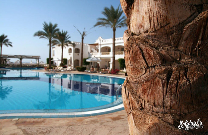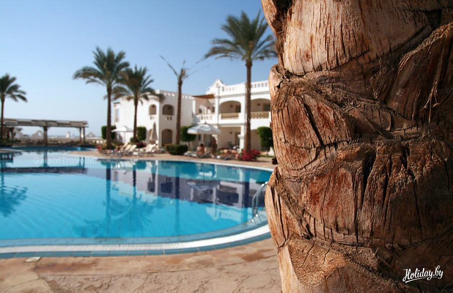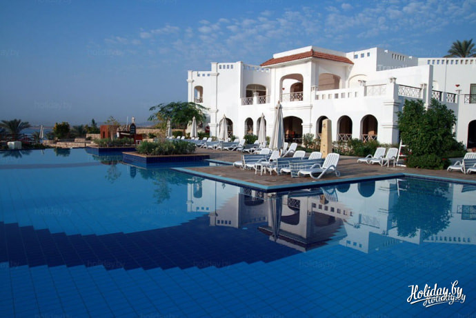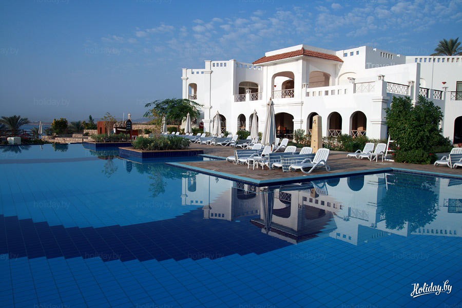 А вот, собственно, и он. Вероятно, я бы мог сказать много слов о том, чем этот отель отличается от других, если бы я побывал 16 раз в Египте, как те люди, с кем мы были переселены сюда. Для нас основным признаком "хорошести" отеля стала многолюдность довольных лиц на рецепции и огромный балкон с видом на море на третьем этаже главного корпуса. Заселены мы были в "виллы": этаж первый, белье сухое, тумбочка между кроватями (исправили в процессе), унитаз наличествует, бассейн с баром рядом.
