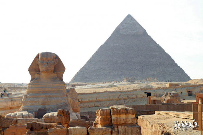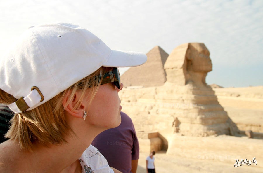 Вероятно, это одна из самых заурядных фотографий со Сфинксом, которая может быть. Многочисленные гиды то и дело подсказывают туристам как надо встать, чтобы на снимке коснуться Его носом, чтобы он был на руке, чтобы его пощекотать и прочая египетская фото-камасутра. Предлагаю издать справочник "100 лучших поз" и вручать каждому на такой экскурсии. Поэтому серьезность "животного" нарушает пестрая толпа желающих освоить очередную позу.